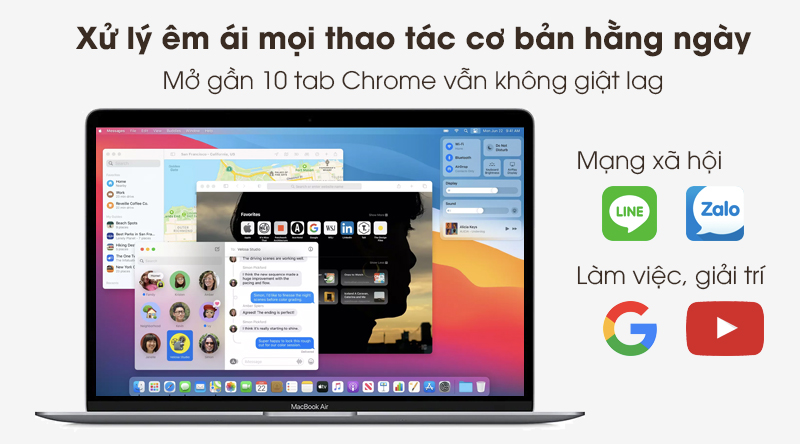 MacBook Air 2020 sở hữu chip Core i3 thế hệ 10, tốc độ tối đa 3.2 GHz, RAM 8 GB xử lý êm ái mọi thao tác cơ bản hằng ngày, mở gần 10 tab Chrome mà máy vẫn không có hiện tượng lag.