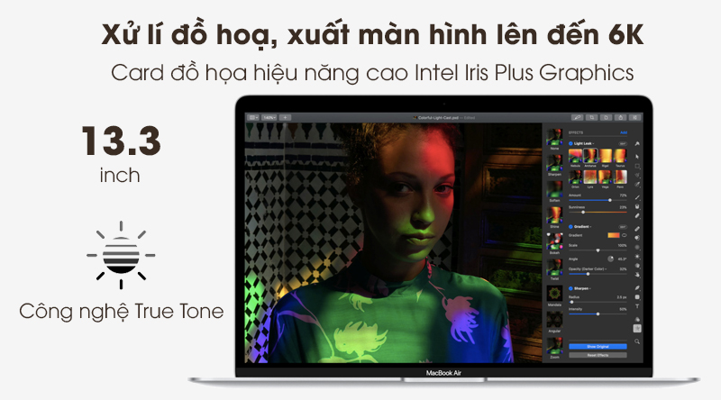 Màn hình Retina kích thước 13.3 inch hiển thị hình ảnh sắc sảo từng chi tiết, công nghệ TrueTone độc quyền tinh chỉnh màu sắc thực cho hình ảnh luôn đều màu khi bạn di chuyển từ môi trường phòng sang nơi nắng gắt mà không bị chói hay nhòe hình.