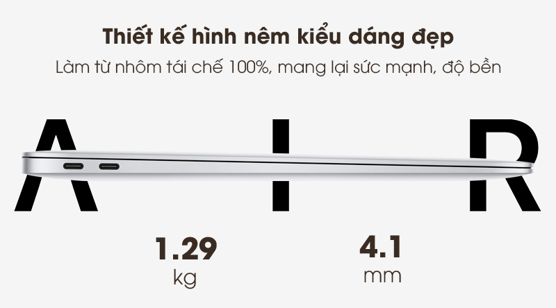 Không còn xa lạ gì với thiết kế của nhà Apple nữa, MacBook Air 2020 luôn nằm trong top laptop mỏng nhẹ bậc nhất chỉ với 1.29 kg, chỗ dày nhất cũng ở mức 16.1 mm nên việc cầm máy trên tay cũng giống như cầm 1 cuốn sách 150 trang vậy.