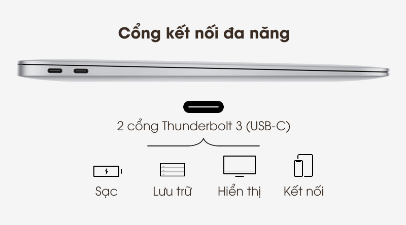 | Cổng sạc | 2 cổng Thunderbolt 3 (USB-C) ports with support for: Charging DisplayPort Thunderbolt (up to 40Gb/s) USB 3.1 Gen 2 (up to 10Gb/s) |