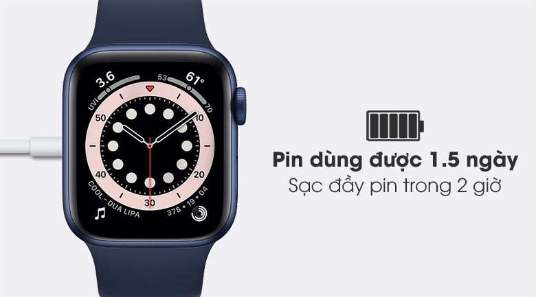 Cáp sạc từ tính đi kèm theo đồng hồ sẽ giúp pin đầy trong khoảng 2 giờ. Khi đã đầy pin, bạn yên tâm dùng Apple Watch Series 6 trong vòng 1.5 ngày. Khi cần sạc, bạn chỉ cần đặt nó lên bộ sạc đế nam châm vừa hiện đại, vừa nhỏ gọn để nhanh chóng sạc đầy pin mà không cần phải cắm dây sạc rườm rà.