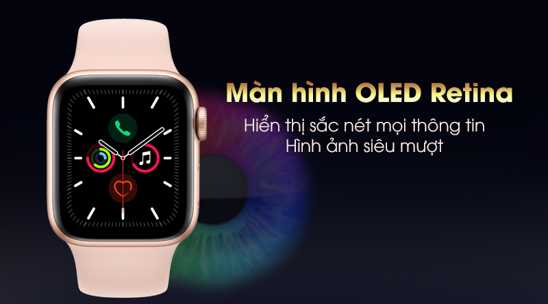 Màn hình trên Apple Watch S5 44mm sử dụng tấm nền OLED cao cấp, tiết kiệm pin hơn, độ sắc nét đạt chuẩn Retina - nghĩa là bạn rất khó để nhận biết các điểm ảnh, rỗ hạt bằng mắt thường.