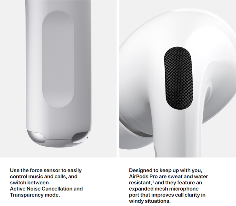 AirPods Pro với cảm biến lực giúp kiểm soát ngay trên tai nghe. Cụ thể, bạn cần nhấn 1 lần để phát, tạm dừng hoặc trả lời cuộc gọi điện thoại. Nhấn 2, 3 lần để bỏ qua, nhân và giữ để chuyển giữa chế độ khử tiếng ồn chủ động và chế độ trong suốt.