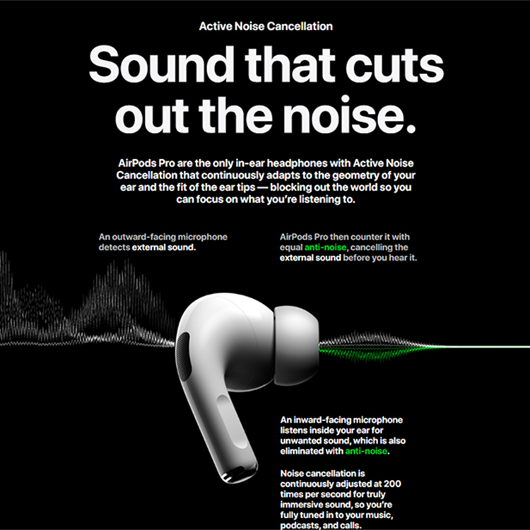 AirPods Pro thiết kế một micro hướng ra ngoài giúp phát hiện âm thanh. Sau khi phát hiện âm thanh, AirPods Pro ngay lập tức sẽ loại bỏ âm thanh bên ngoài đó trước khi bạn nghe thấy nó. Một micrô hướng vào bên trong giúp lắng nghe những âm thanh bên trong tai bạn. Tương tự với micro hướng ra bên ngoài, micro bên trong cũng kiểm tra những âm thanh không mong muốn và loại bỏ chúng.