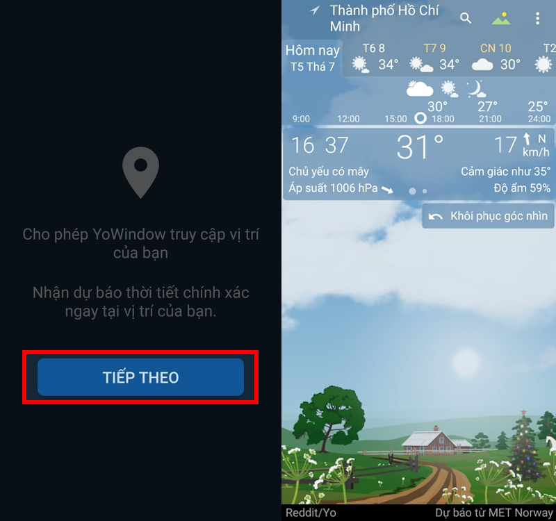 Bước 2: Hãy đồng ý truy cập vị trí cho ứng dụng để nó có thể cập nhật đúng thời tiết và thời gian cho điện thoại của bạn. Sau đó bạn sẽ vào được màn hình chính của ứng dụng.