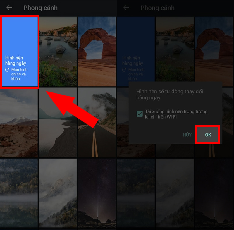 Bước 2: Sau khi cài đặt thành công hãy mở ứng dụng lên và chọn cho bạn một chủ đề yêu thích, rồi chọn vào Hình nền cập nhật hằng ngày và OK để thay đổi được hình nền.