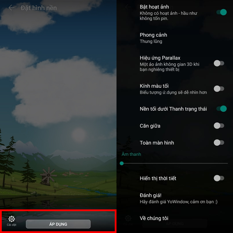 Bươc 4: Bấm vào Áp dụng để đặt màn hình chính của ứng dụng làm màn hình nền của bạn. Chọn vào biểu tượng cài đặt để hiển thị thêm một số cài đặt tiện ích mà có thể hữu ích cho bạn đó.