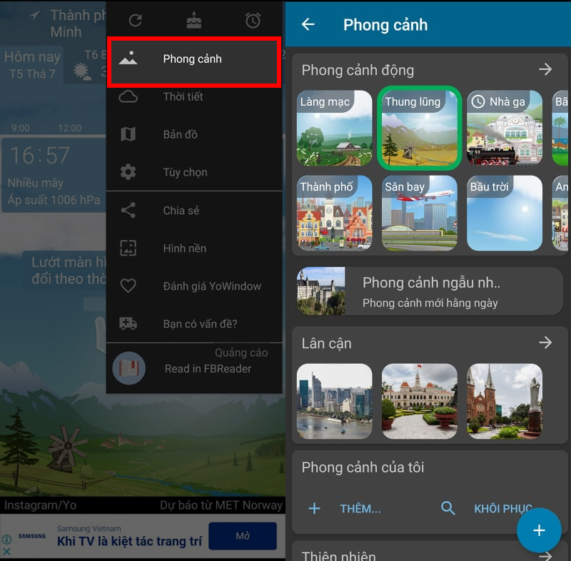 Bước 5: Ngoài ra bạn có thể chọn vào Phong cảnh để thay đổi ảnh nền nhé. Chọn cho mình một cảnh thích hợp rồi bấm vào Mở vậy là được rồi.